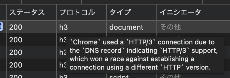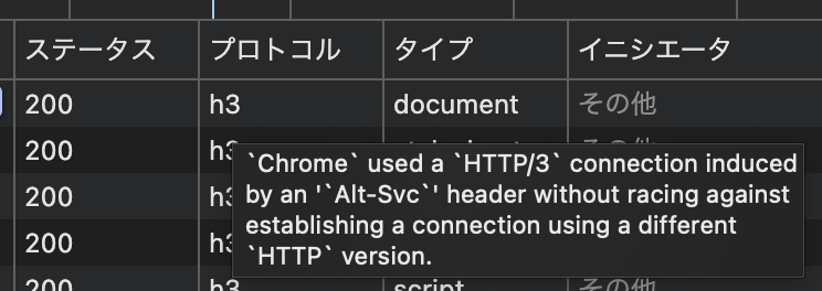 ずーーーと「なんでh3にならんのかな〜」ということをやってたけど、この開発者ツールのプロトコルの部分にホバーすると理由が出るということにようやく気付いた。ただ出ないこともある